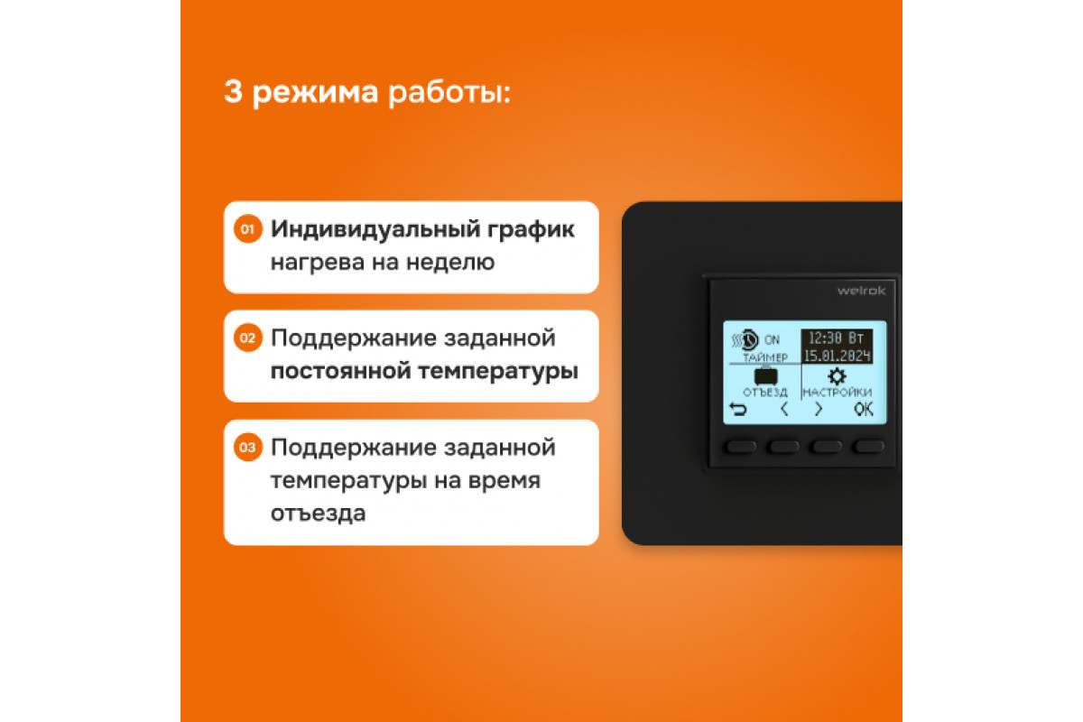 Welrok PRO BK оснащён функцией недельного программирования, позволяющей задавать до 16 временных интервалов для каждого дня недели. Это обеспечивает оптимальный режим обогрева в зависимости от вашего распорядка дня.​