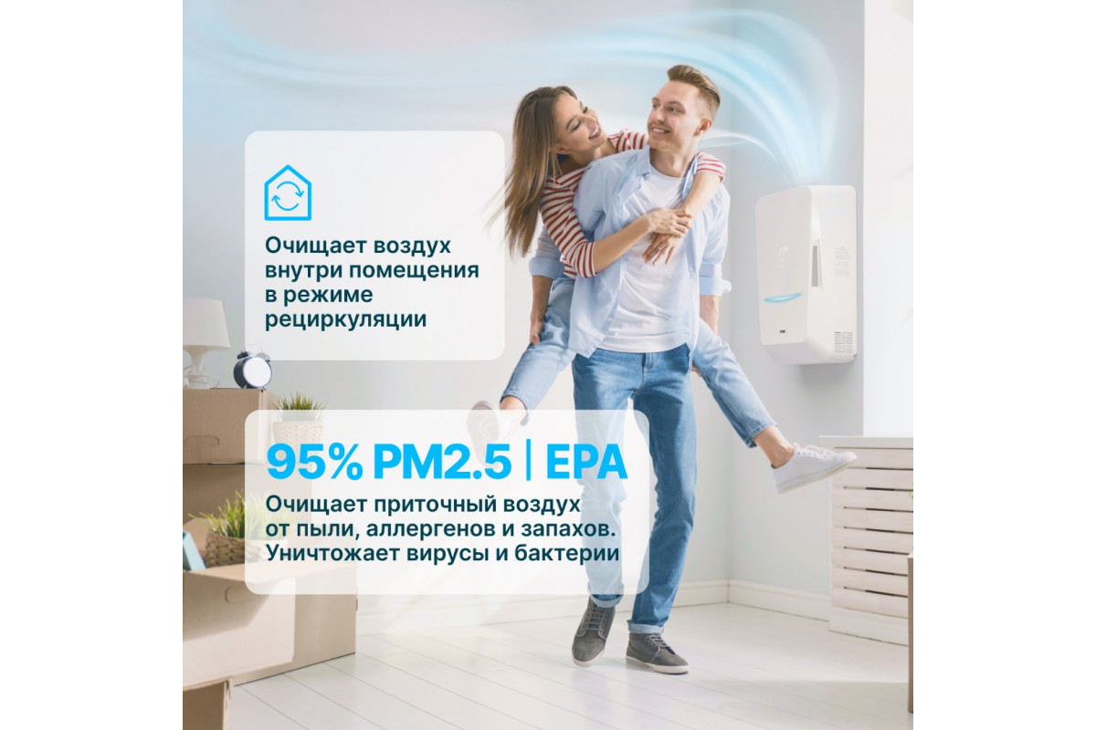 Система фильтрации включает G4 для улавливания крупной пыли и комбинированный фильтр E11+АК. Этот фильтр удаляет загрязнения, пыль, PM2.5, сажу, тополиный пух, пыльцу, споры плесени, вредные газы и неприятные запахи.