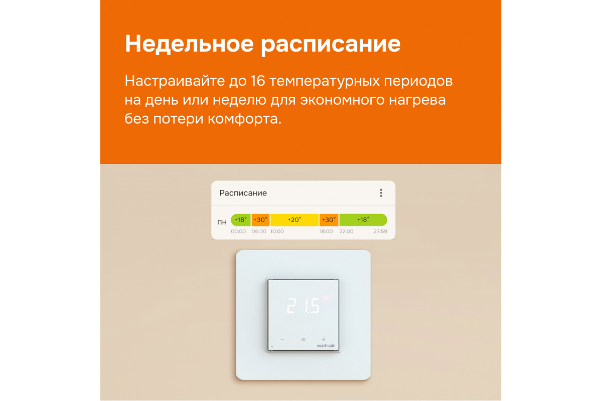 С помощью фирменного приложения Welrok, доступного в Google Play и App Store, вы можете управлять обогревом из любой точки мира. Функция геозонирования автоматически снижает температуру, когда вы покидаете дом, и восстанавливает комфортный режим при возвращении, что способствует экономии энергии.