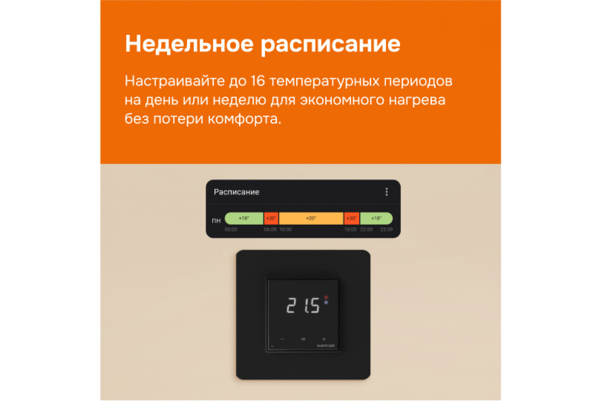 Программируемое расписание: настройка до 16 температурных периодов на каждый день недели позволяет адаптировать обогрев под ваш график.