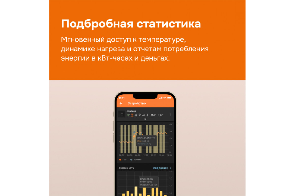 Статистика потребления энергии: отслеживайте расходы на отопление в кВт·ч и денежном выражении через приложение.