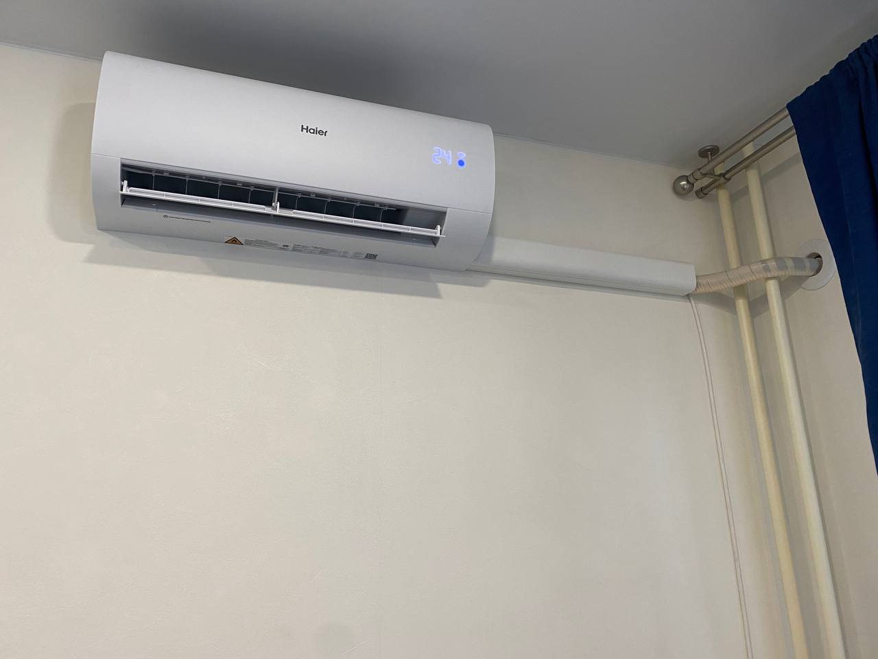 Компания БУРАН из Новосибирска недавно столкнулась с интересной задачей по установке кондиционера Haier в квартире-студии на ул. Ошанина. Наши специалисты выполнили монтаж таким образом, чтобы обойти трубы стояка отопления, что позволило скрыть открытую часть магистрали за шторкой.