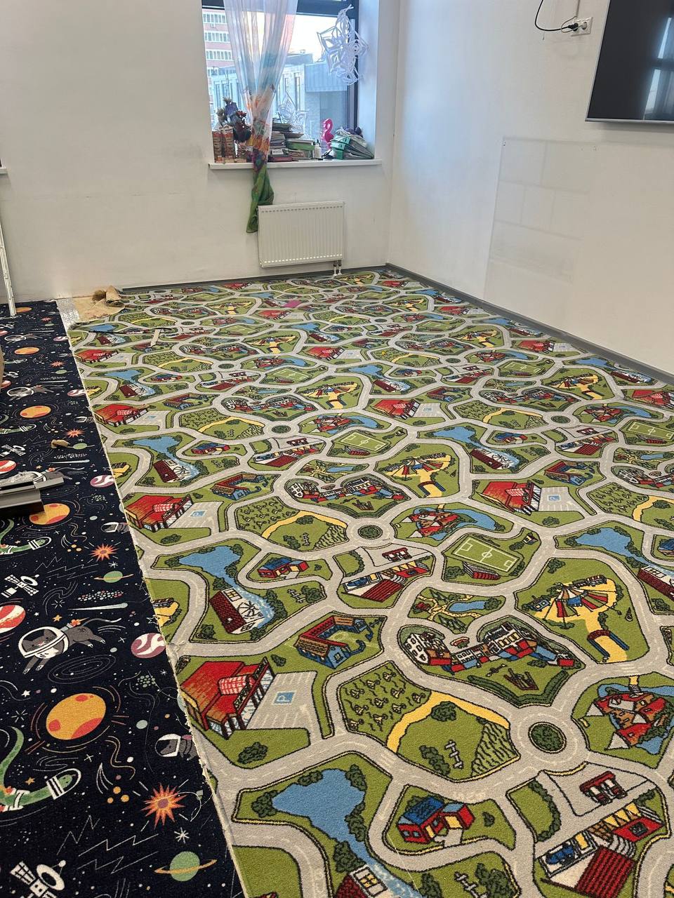 Завершающим этапом стала укладка нового ковролина. Было выбрано яркое и весёлое покрытие, соответствующее атмосфере детской комнаты. Ковролин не только добавляет уюта, но и служит дополнительным слоем теплоизоляции, что особенно важно для помещений, где дети проводят много времени на полу. Правильная укладка ковролина поверх тёплого пола обеспечивает долговечность и эффективность всей системы обогрева.