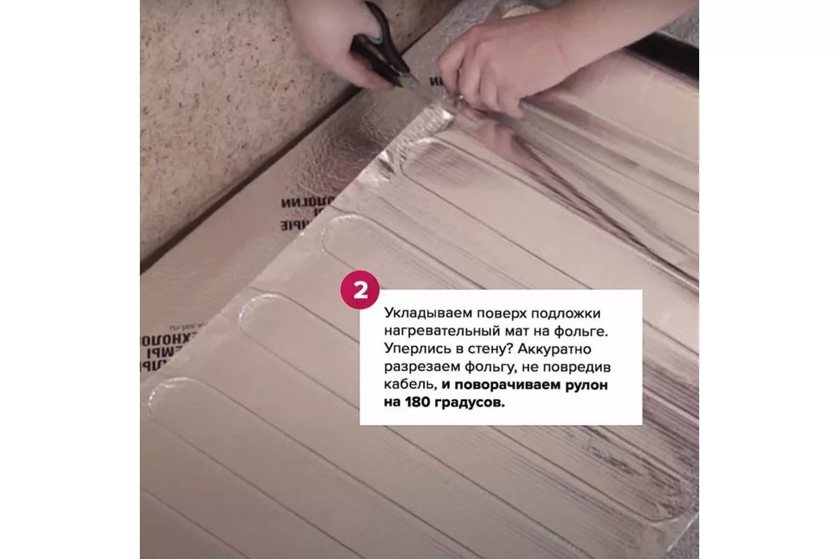 - Тонкий теплый пол на основе миниатюрного нагревательного кабеля, уложенного между слоями фольги.
