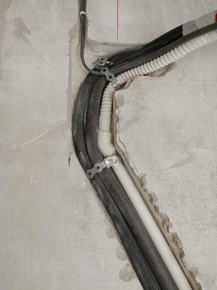 После завершения штробления начинается укладка фреоновых труб, дренажных труб и электрических кабелей. Все элементы трассы тщательно изолируются, чтобы избежать конденсата и сохранить теплоизоляцию. Для этого используются специальные материалы, обеспечивающие долговечность системы.