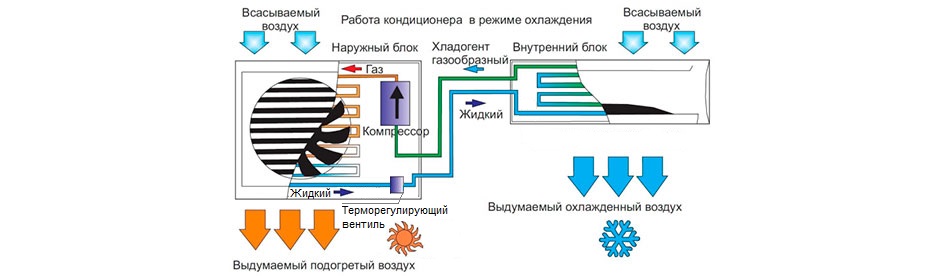 Внутри кондиционера холодильный агент поступает в теплообменник внутреннего блока. Здесь он охлаждает воздух, проходящий через теплообменник, и сам при этом нагревается. Важным процессом, обеспечивающим низкие температуры, является кипение холодильного агента в этом теплообменнике.